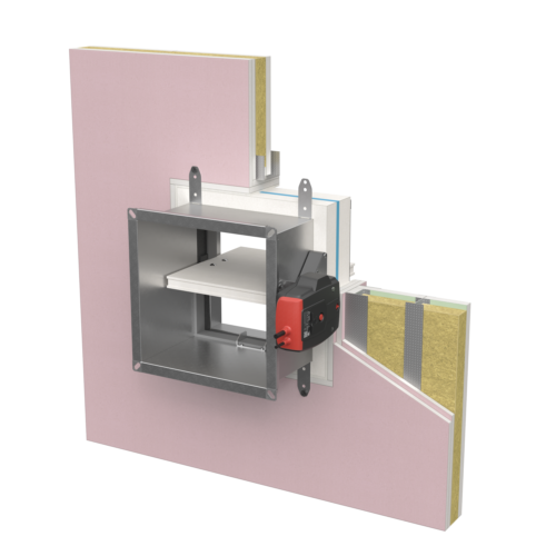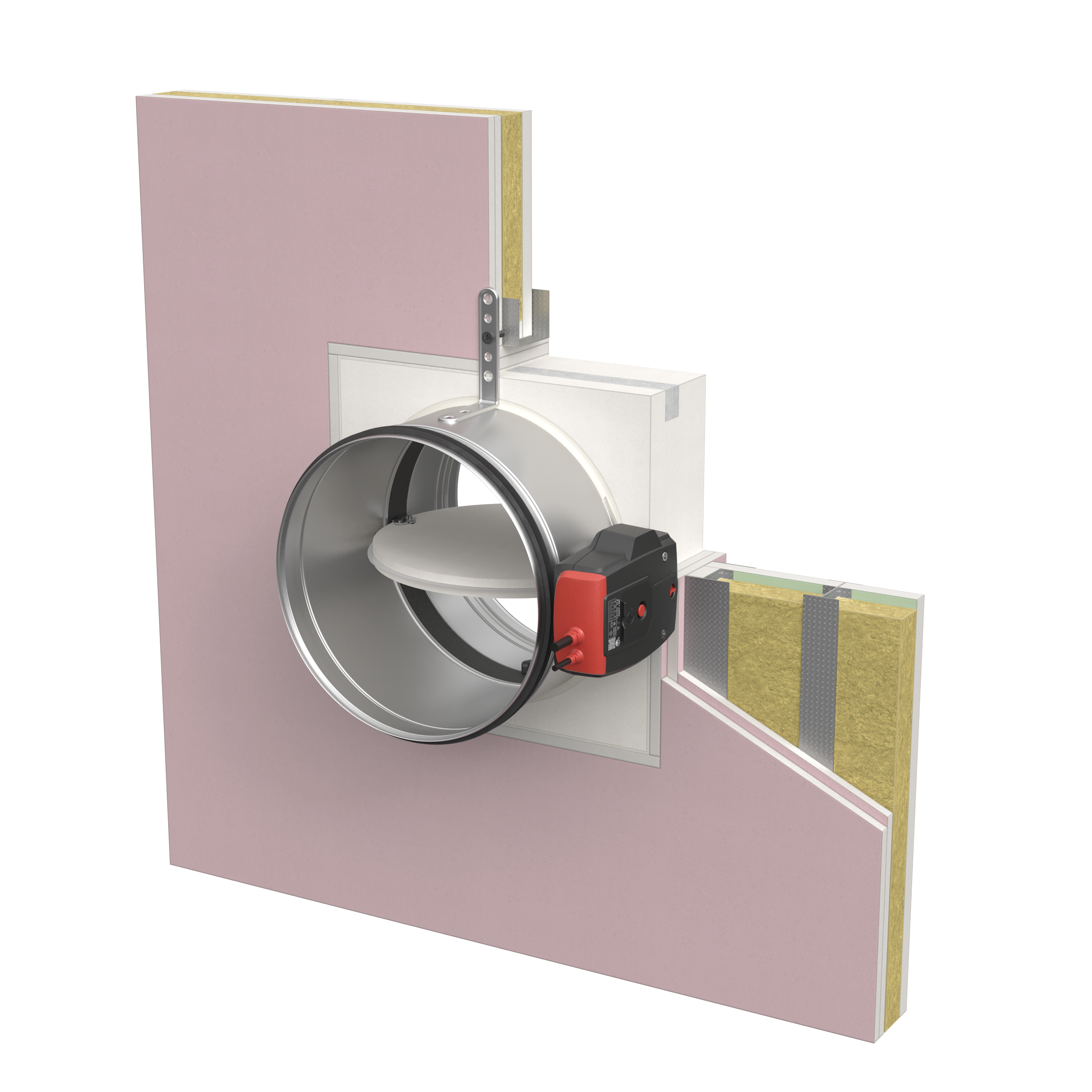 Our fire dampers comply with product standard EN 15650, are tested to EN 1366-2, and classified to EN 13501-3. This delivers a CE-/UKCA-certified solution where fire resistance and integrity criteria are demonstrably met. Testing covers shaftwall configurations—including drylining as well as masonry and concrete—so you can specify with confidence for real-world risers.