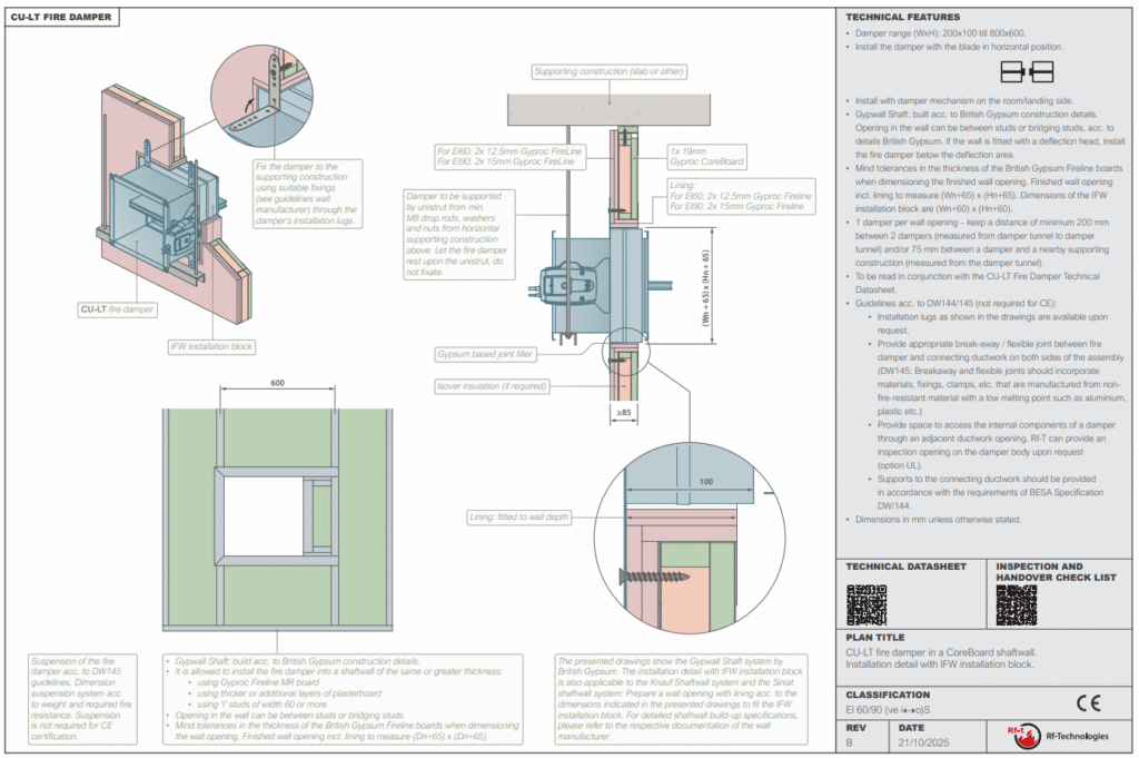 Fire dampers are essential safety products installed where ducts penetrate fire-rated shaftwalls to stop fire and smoke spread, preserve wall integrity, and protect occupants. Rf-Technologies’ CR60 (circular) and CU-LT (rectangular) fire dampers are CE/UKCA-marked, tested to EN 1366-2, and approved for shaftwalls.